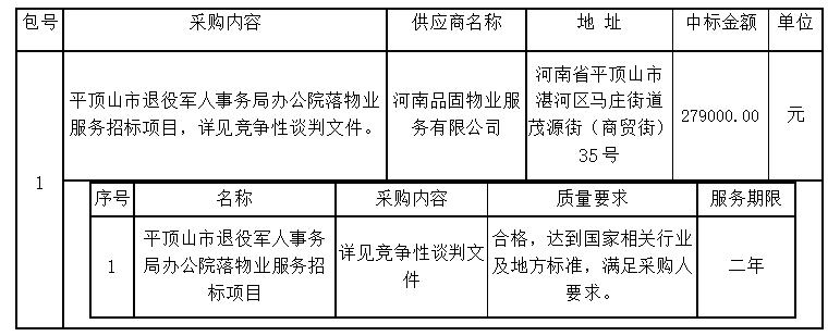 1、根据评标结果、中标结果公示,按照国家有关规定,确定河南品固物业服务有限公司为成交供应商,其他供应商未中标。